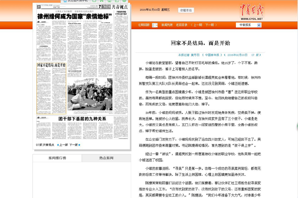 2016年2月3日,《中国青年报》 07 版以《回家不是结局,而是开始》为题报道了我校经济管理与人文学院健行社会工作服务中心专业社工介入寻亲家庭的先进事迹。(新闻链接:http://zqb.cyol.com/html/2016-02/03/nw.D110000zgqnb_20160203_3-07.htm)
