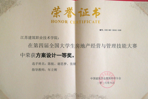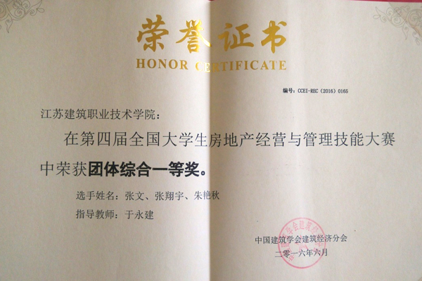 近日,第四届全国高职与应用本科院校房地产经营管理大赛圆满结束,由建筑工程管理学院于永建、年立辉老师指导的两支队伍代表我校参加了大赛。经过激烈角逐,张文,张翔宇,朱艳秋同学组成的参赛队伍获“团体综合”一等奖,陈航、谢思梦、张娅同学组成的参赛队伍获“方案设计”一等奖。