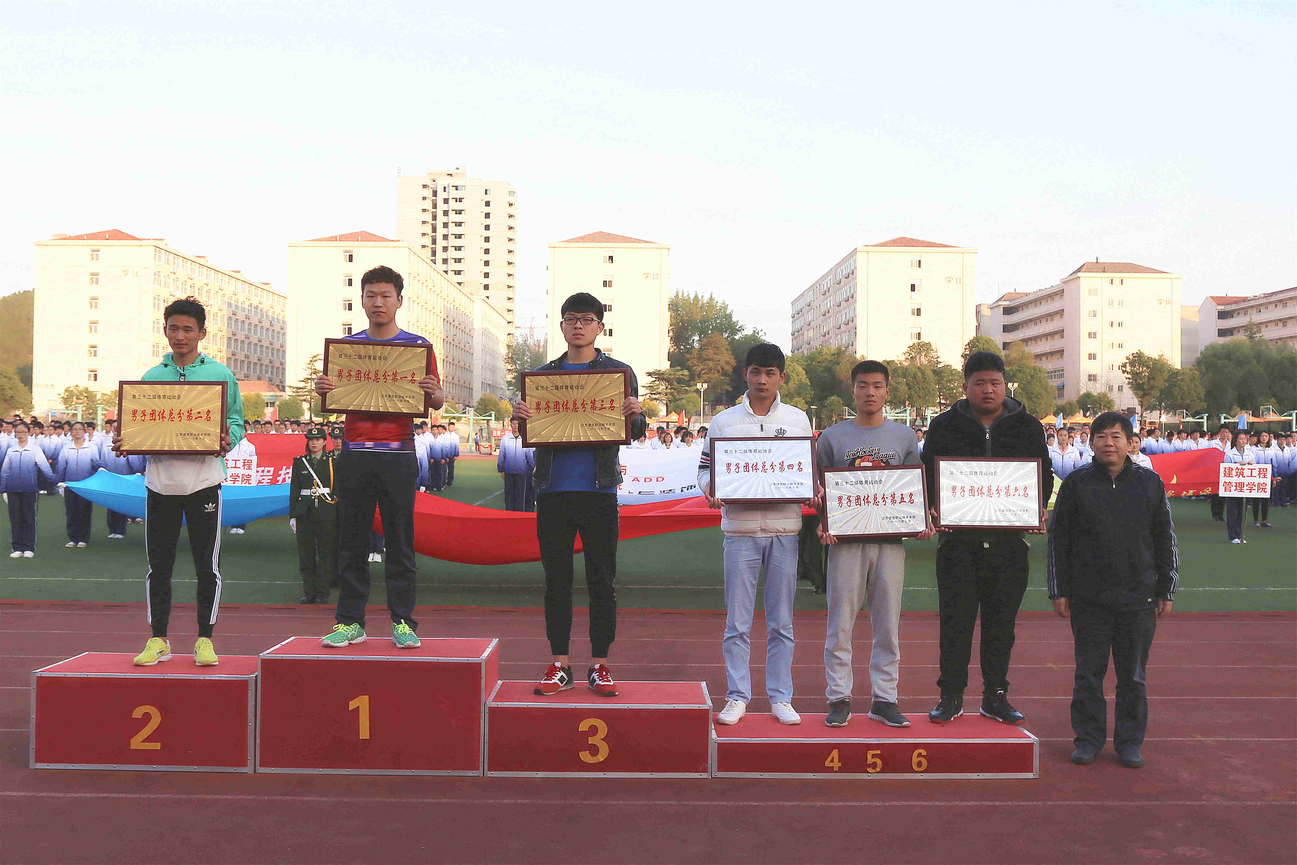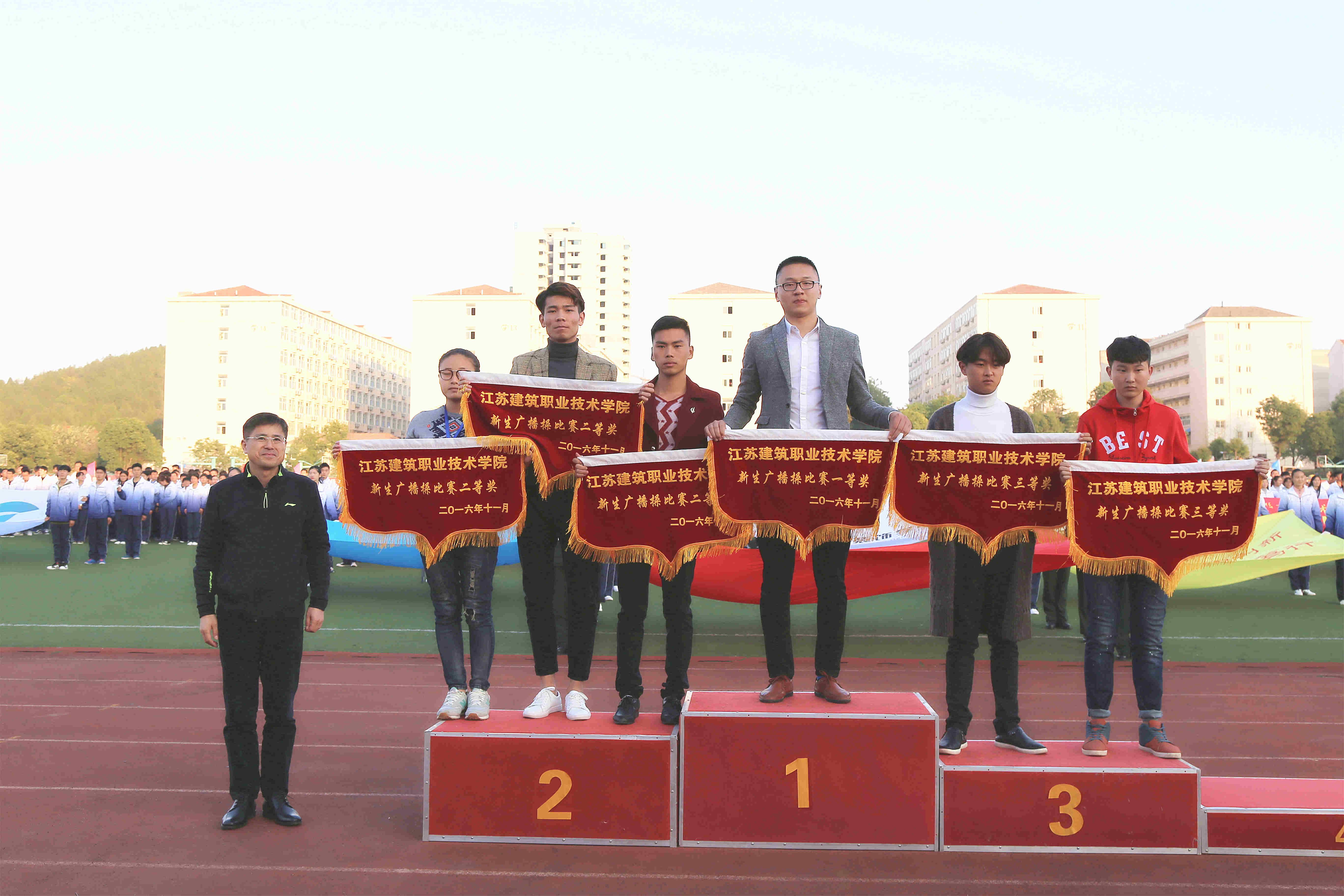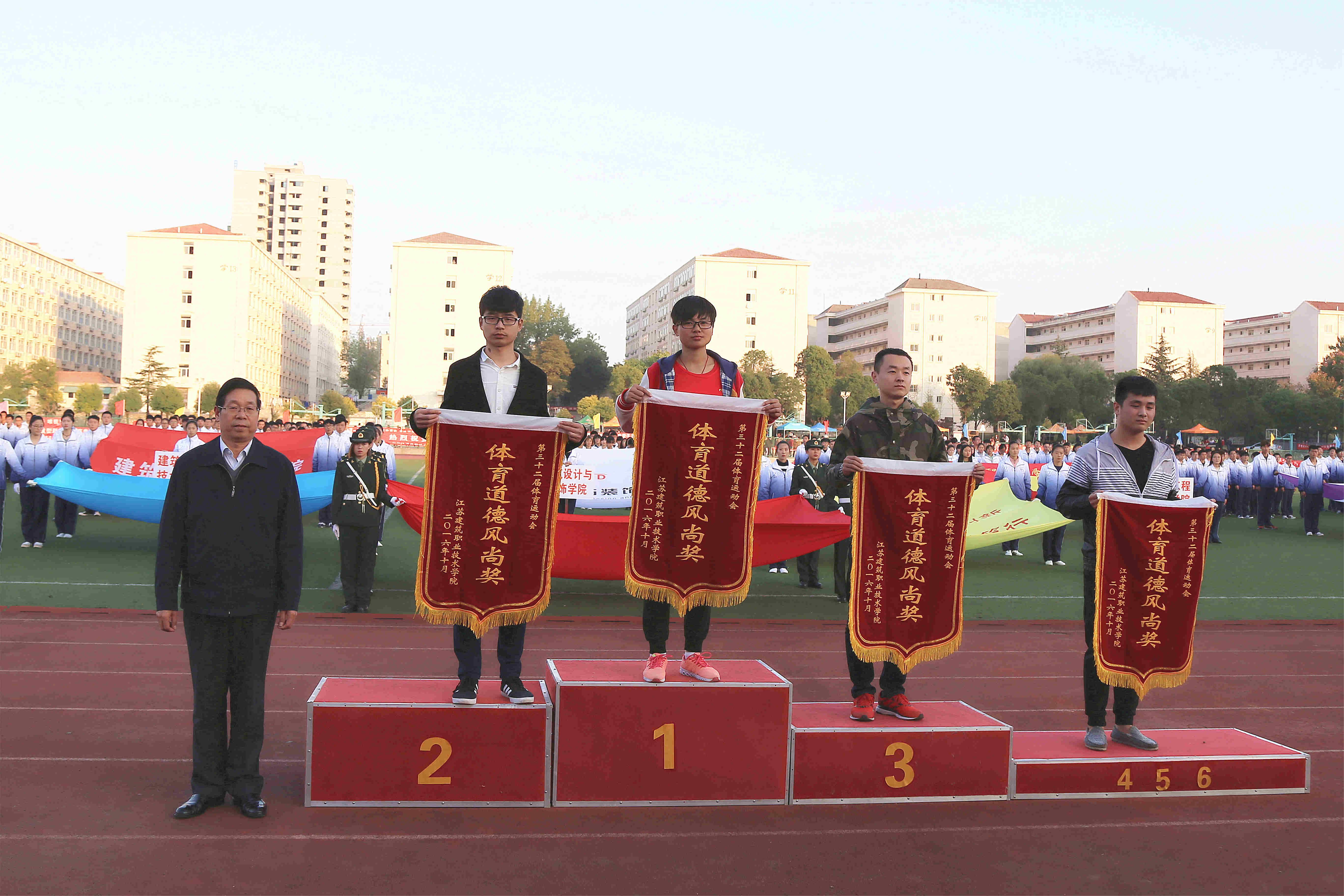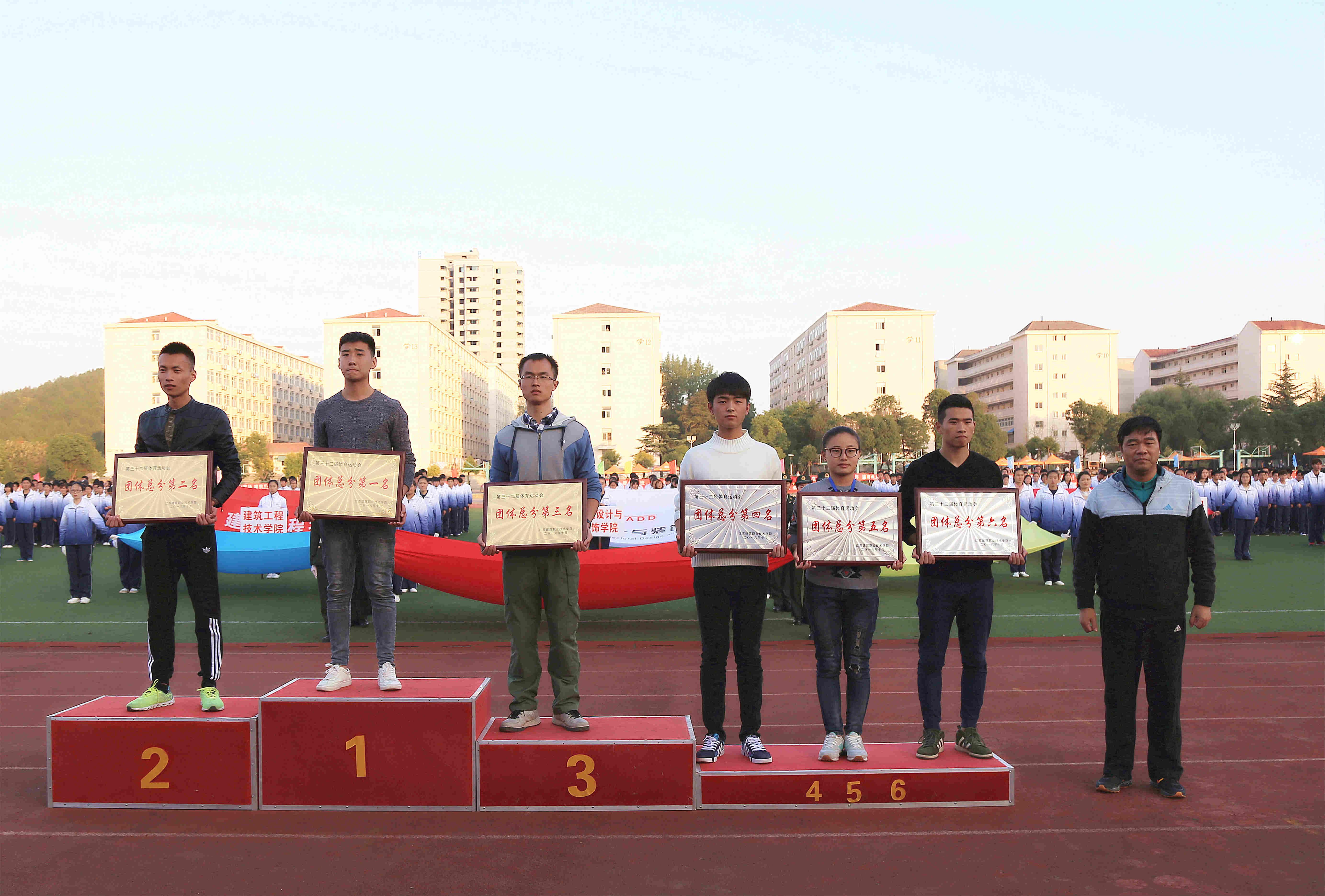 在教职工广播操比赛中机电学院党总支、机关第一党总支、后勤党总支获得前三名,在学生广播操比赛中建工学院、设备学院分获一、二名,经管学院、传媒学院并列第三名。建工16-7班、留学生班等20个班级被授予“精神文明班级”荣誉称号,经过微信评比、评委打分,建工学院、能源学院、建管学院、传媒学院荣获本届运动会“体育道德风尚奖”。