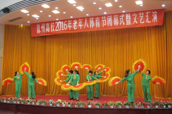 11月23日下午,徐州高校2016年老年人体育节闭幕式暨文艺汇演在徐州医科大学举行,我校肖仁政、武荣权老师表演的男声二重唱《相逢是首歌》以及高瞻老师等10人表演的舞蹈《我爱你,中国》,得到了在场领导和观众的热烈掌声。来自11所高校200余名老年人展示了太极拳、古典舞《春江花月夜》和舞蹈《我爱你,中国》等15个文艺节目。