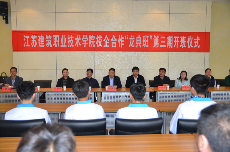 4月8日上午,校企合作“龙典班”第三期开班典礼在我校建筑技术馆会议室举行。院长孙进教授及江苏龙典建设集团有限公司董事长钱亚兵、经理陈林林、人事主管谢迎霞出席开班仪式,设备学院、能源学院党政领导及市政、路桥专业老师,“龙典班”30名学员参加了开班仪式。
