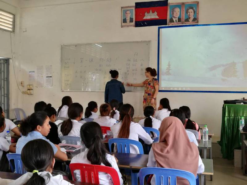 相比较老挝的小班课,柬埔寨管理经济大学的班级相对庞大,参加语言培训的都是在校的预科班学生,学习中文的热情高涨,课堂里50名学生是最小班,通常75名学生,最大的班级人数达到120人。校长助理禅熙女士解释说,学生学习汉语的高涨热情和积极性无法打击,他们提前调整了自己的专业课时间,专门留出学汉语的时间段,导致班级规模较大。