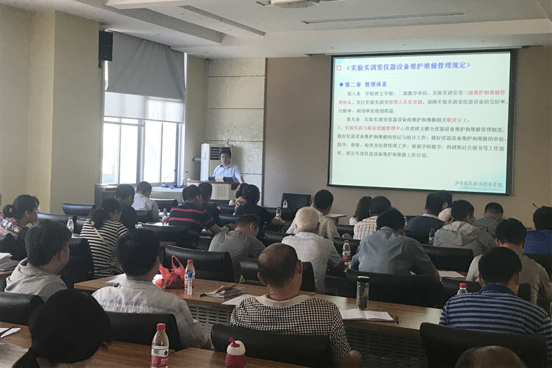 9月11日下午,我校在建筑技术馆会议室举办了首届校内实践教学培训班,结合我校实践教学实际情况和近期出台的相关实践教学管理文件,从职业技能竞赛组织、实验实训仪器设备维护与维修、实验实训耗材采购与使用、实验实训室安全综合管理等四个方面对相关人员进行了培训。