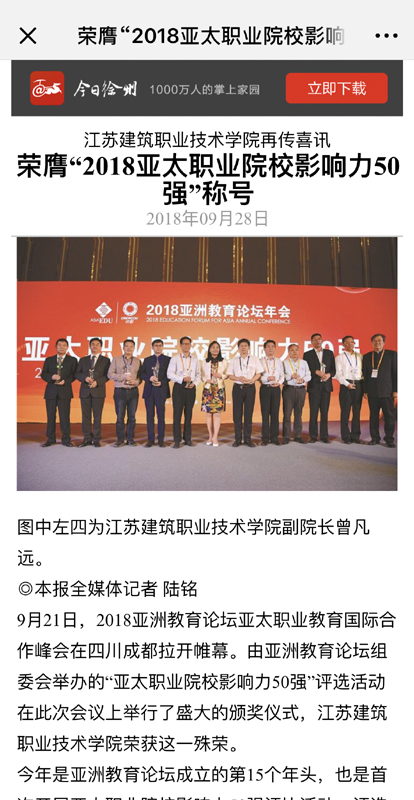 近日,我校荣膺“2018亚太职业院校影响力50强”称号受到今日徐州APP关注。