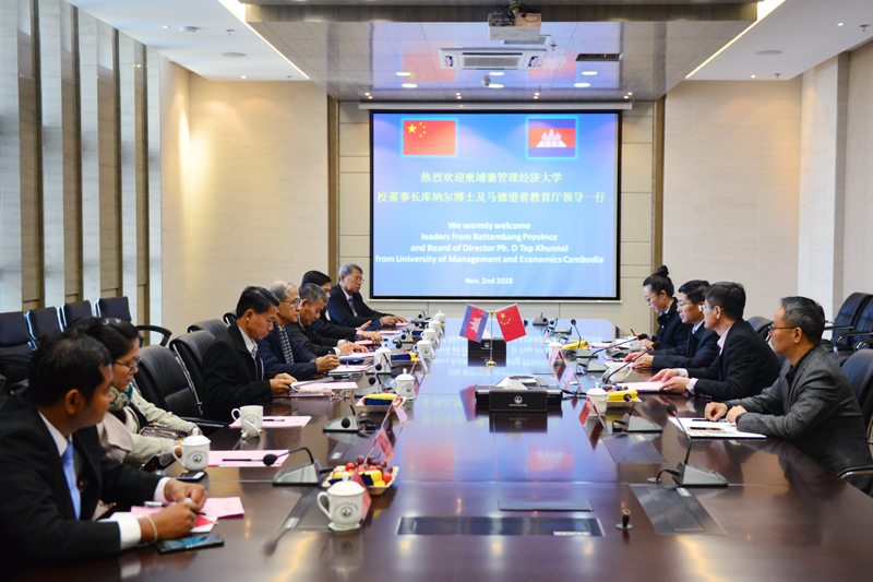 11月1日至2日,柬埔寨马德望省人民党组成员苏萨让先生、柬埔寨管理经济大学校董事长特普博士一行9人访问我校,就深度合作事宜进行洽谈。我校院长沈士德、副院长曾凡远在图书馆会议室与来访客人座谈。国际处、国际交流学院等相关负责人参加座谈。