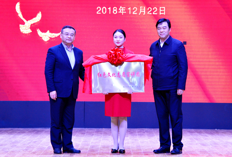 在红色故事宣讲会上,我校党委书记孙进、徐州市委宣传部副部长吕岩共同为学校“红色文化志愿宣讲团”揭牌;南京雨花台烈士陵园管理局社教部讲解接待科科长郭琦、江苏省广播电视总台主持人刘静渊等5名讲解员受聘担任“红色文化志愿宣讲团”指导老师,我校党委副书记梁惠、徐州市社科联副主席孙法亮为指导老师颁发聘书;淮海战役烈士纪念塔管理局局长蒋越锋、我校副院长蒋兆峰共同为我校与淮塔管理局共建的“爱国主义与革命文化教育实践基地”揭牌。