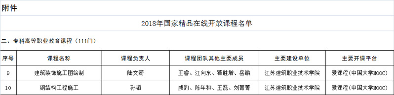 近日,教育部发布了《关于公布2018年国家精品在线开放课程认定结果的通知》(教高函【2019】1号),我校陆文莺老师负责的《建筑装饰施工图绘制》和孙韬老师负责的《钢结构工程施工》2门课程榜上有名,实现了我校国家级在线开放课程零的突破,为我校建设江苏省卓越高职院校和申报中国特色高水平高职院校的奋斗目标起到重要的支撑作用。