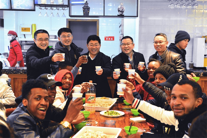 2月4日,农历大年三十,院长沈士德与我校来自老挝、柬埔寨、科摩罗、津巴布韦、哈萨克斯坦等国家的160余名留学生在学校留学生餐厅欢聚一堂,共同庆祝中国传统节日——春节。党委宣传部、教务处、学工处和国际交流学院等部门负责人参加了活动。