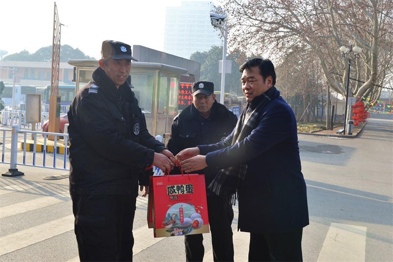 孙进一行先后来到东大门保安室、后勤供暖中心、学生公寓、校医院等值班点,慰问奋战在一线的工作人员。他亲切地询问值班工作情况,并代表学校向大家致以新春问候和良好祝愿,感谢他们牺牲节日休假坚守工作岗位,希望能够继续维护好寒假期间校园的和谐有序和安全稳定。