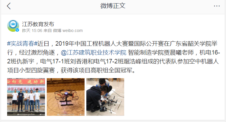 #实战青春#近日,2019年中国工程机器人大赛暨国际公开赛在广东省韶关学院举行,经过激烈角逐,@华体会体育智能制造学院贾晨曦老师,机电16-2班仇新宇,电气17-1班刘香港和电气17-2班踞浩峰组成的代表队参加空中机器人项目小型四旋翼赛,获得该项目高职组全国冠军。