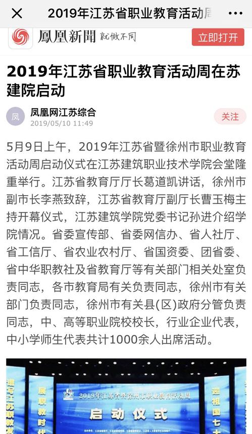 5月9日上午,2019年江苏省暨徐州市职业教育活动周启动仪式在华体会体育会堂隆重举行。江苏省教育厅厅长葛道凯讲话,徐州市副市长李燕致辞,江苏省教育厅副厅长曹玉梅主持开幕仪式,江苏建筑学院党委书记孙进介绍学院情况。省委宣传部、省委网信办、省人社厅、省工信厅、省农业农村厅、省国资委、团省委、省中华职教社及省教育厅等有关部门相关处室负责同志,各市教育局有关负责同志,徐州市有关部门负责同志,徐州市有关县(区)政府分管负责同志,中、高等职业院校校长,行业企业代表,中小学师生代表共计1000余人出席活动。