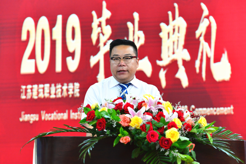 教师代表建造学院孙韬老师、毕业生代表财会16-1班曹艳琪同学发言。相关职能部门负责人、各学院党政负责人、全体专兼职辅导员和2019届3995名毕业生以及45名留学生毕业生参加典礼。