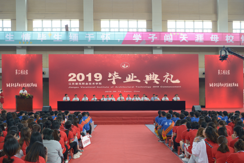 典礼在我校师生共同创作完成的《建院英雄》、《如若初见、不说再见》视频播放中拉开了帷幕。孙进为毕业生代表颁发毕业证书,沈士德致辞,魏勇为优秀毕业生代表颁发荣誉证书,曾凡远为留学生代表颁发毕业证书,蒋兆峰宣读了《关于准予2019届3995名学生毕(结)业的决定》、《关于准予2019届45名留学生毕(结)业的决定》、《关于授予沃千玄等170名同学2019届优秀毕业生称号的决定》。