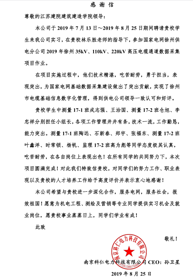8月25日,建筑建造学院收到南京科仁电力科技有限公司CEO孙卫星的感谢信,孙卫星对我校在该公司实习学生的专业技术水平、吃苦耐劳、勇于担当的敬业精神,突出的职业表现给予了高度评价,对我校高质量的人才培养、为企业输送优秀人才表示衷心地感谢。孙卫星还表示,公司将进一步深化与我校的校企合作,为我校学生提供更多的实习机会及就业岗位。