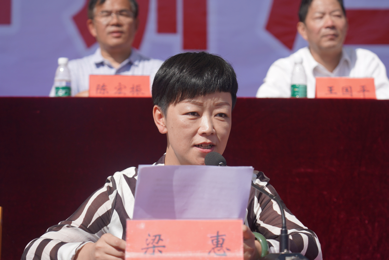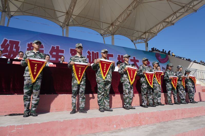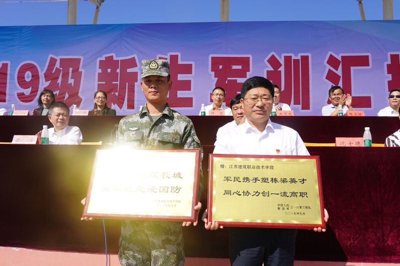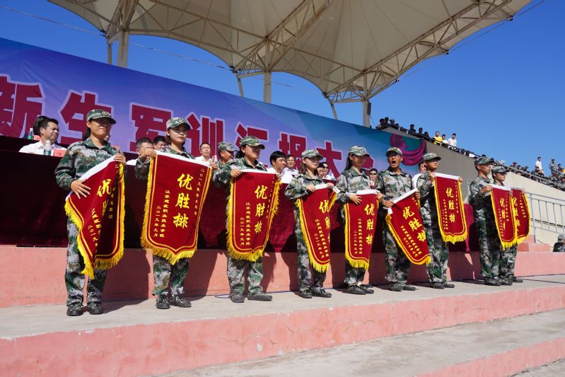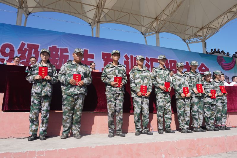 孙进宣布汇报大会正式开始,并与部队领导互赠牌匾。梁惠作总结讲话。她首先向新生军训的圆满成功表示热烈祝贺,并向付出辛勤劳动的首长、教官和其他相关部门人员致以衷心感谢。她在讲话中指出:14天以来,我们被教官感动着、被老师感动着、被自己感动着,同学们在摸爬滚打中学会了吃苦、学会了健体、学会了坚持;在朝夕相处中学会了包容、学会了自律、学会了礼让;在比学赶超中学会了合作、学会了挑战、学会了自强!同学们要坚持好、发扬好在军训中养成的良好作风与习惯,努力成长为政治合格、作风过硬、素质优良、全面发展的高素质人才,为新中国成立70周年献礼、为学校建校40周年献礼。