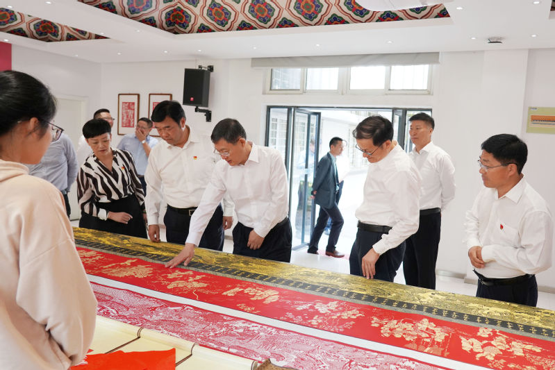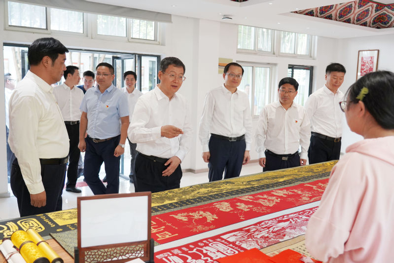 郭文奇一行参观了建筑装饰学院、智慧教学楼、大学科技园、学生非遗作品展等教学、创业场所,听取了学校在加强党的建设、大力推动主题教育、提升信息化水平、改善办学条件等方面的情况。