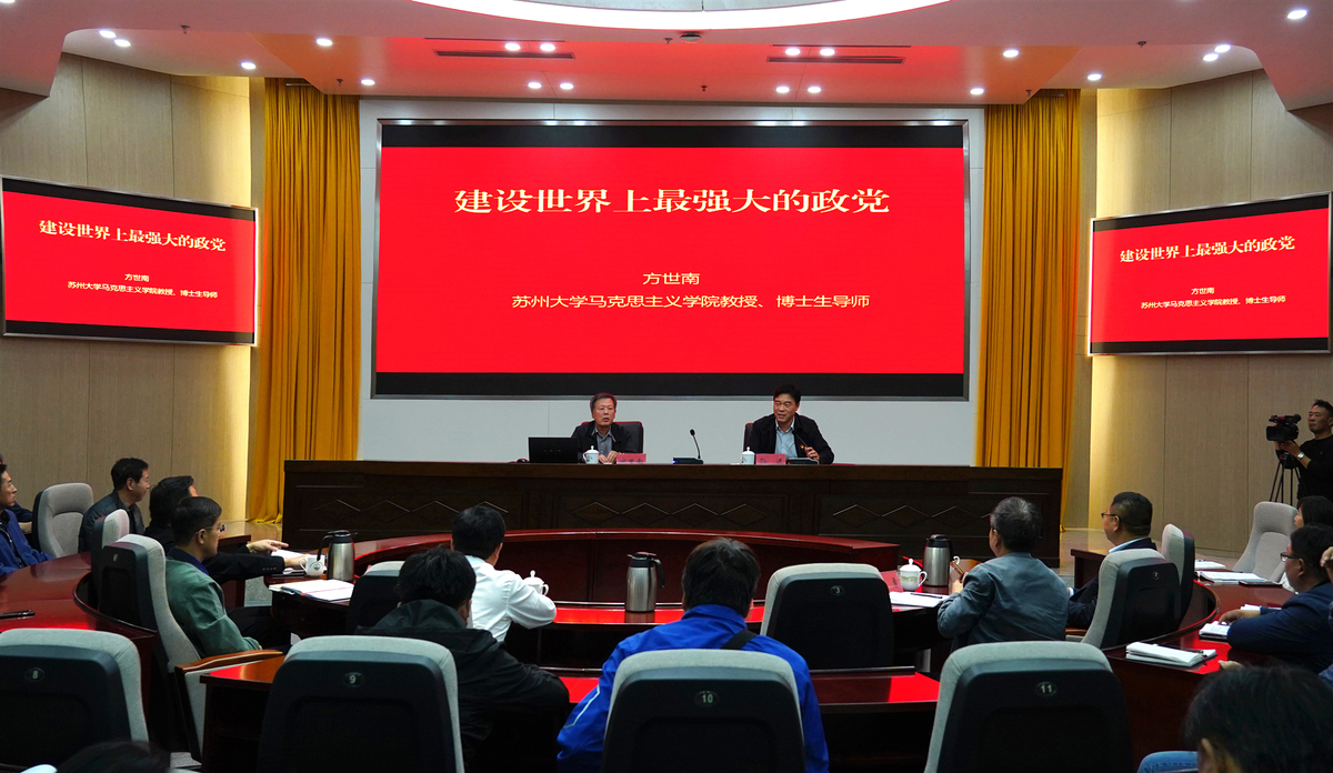 为深入学习贯彻习近平新时代中国特色社会主义思想,扎实推进“不忘初心、牢记使命”主题教育,顺应新形势、把握新要求、担起新使命,10月11日下午,我校邀请苏州大学博士生导师、国务院政府特殊津贴专家方世南教授作《建设世界上最强大的政党》专题报告。报告由党委书记孙进教授主持。