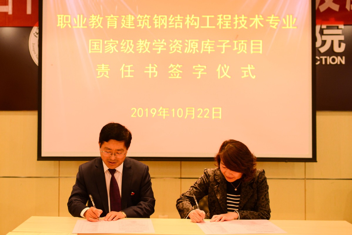 10月22日,建筑钢结构工程技术专业国家教学资源库建设子项目责任书签字仪式在我校利亚楼会议室举行。院长沈士德教授与9位子项目负责人逐一签订责任书,建筑建造学院全体教师参加了仪式。