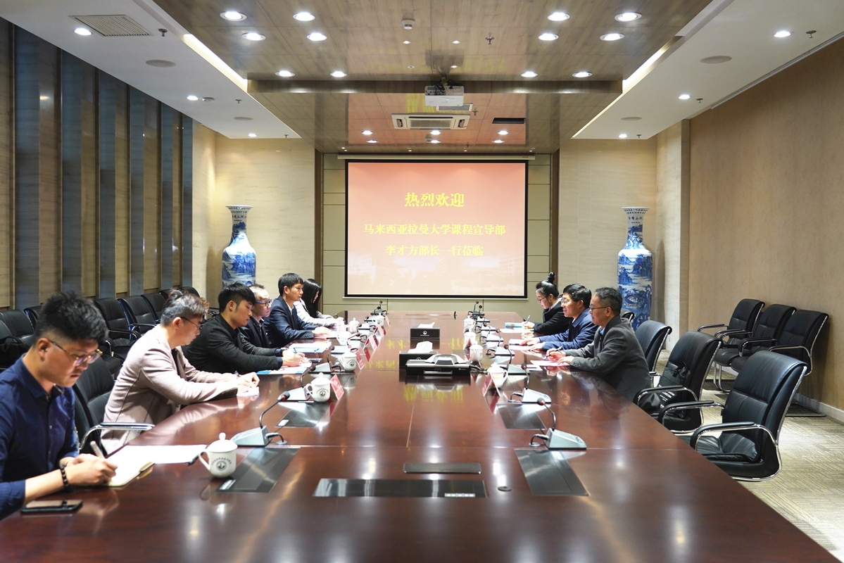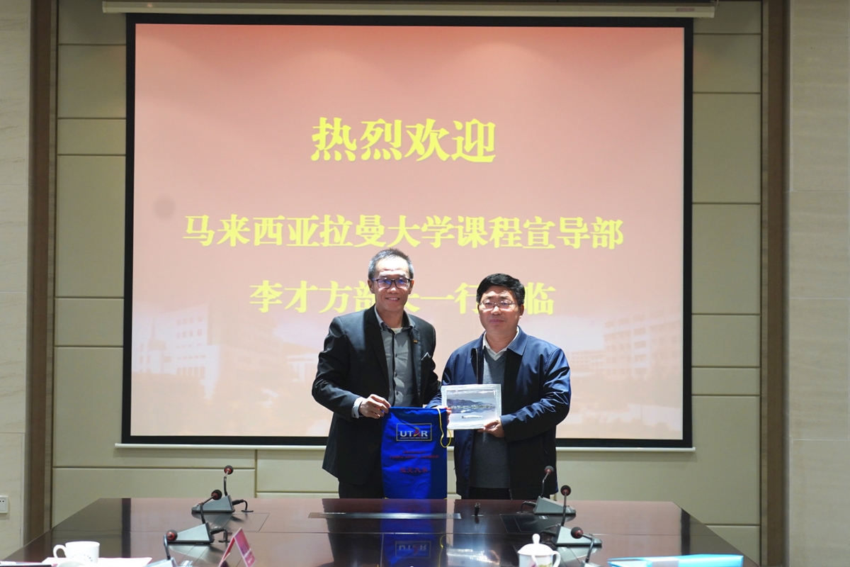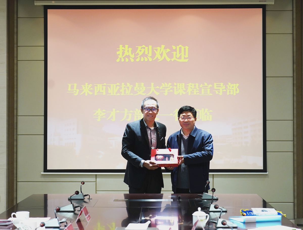 沈士德代表学校对李才方一行表示热烈欢迎,并介绍了学校的办学历史、学科优势、师资状况及国际化发展规划,着重介绍了学校和一带一路沿线国家开展的分校建设及留学生招生情况,期待我校和拉曼大学在教师交流、课程共建,留学生招生及学生短期项目交流等方面开展合作。李方才简要介绍了拉曼大学的办学历史、学科特色及综合实力,表达了希望在学生专升本及本硕连读方面开展合作的愿望,并热情邀请我校择时到访马来西亚,促进两校的交流合作。沈士德对客人的邀请表示感谢,双方互赠礼物并合影留念。