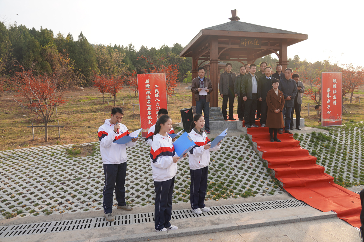 梁惠与校友代表共同为“观德亭”揭牌,并颁发捐赠证书。建筑建造学院院长方桐清、原工民建86-2班班主任陶红林、班长马继金在仪式上讲话,4名在校学生集体吟诵了明代思想大家王阳明的《观德亭记》。
