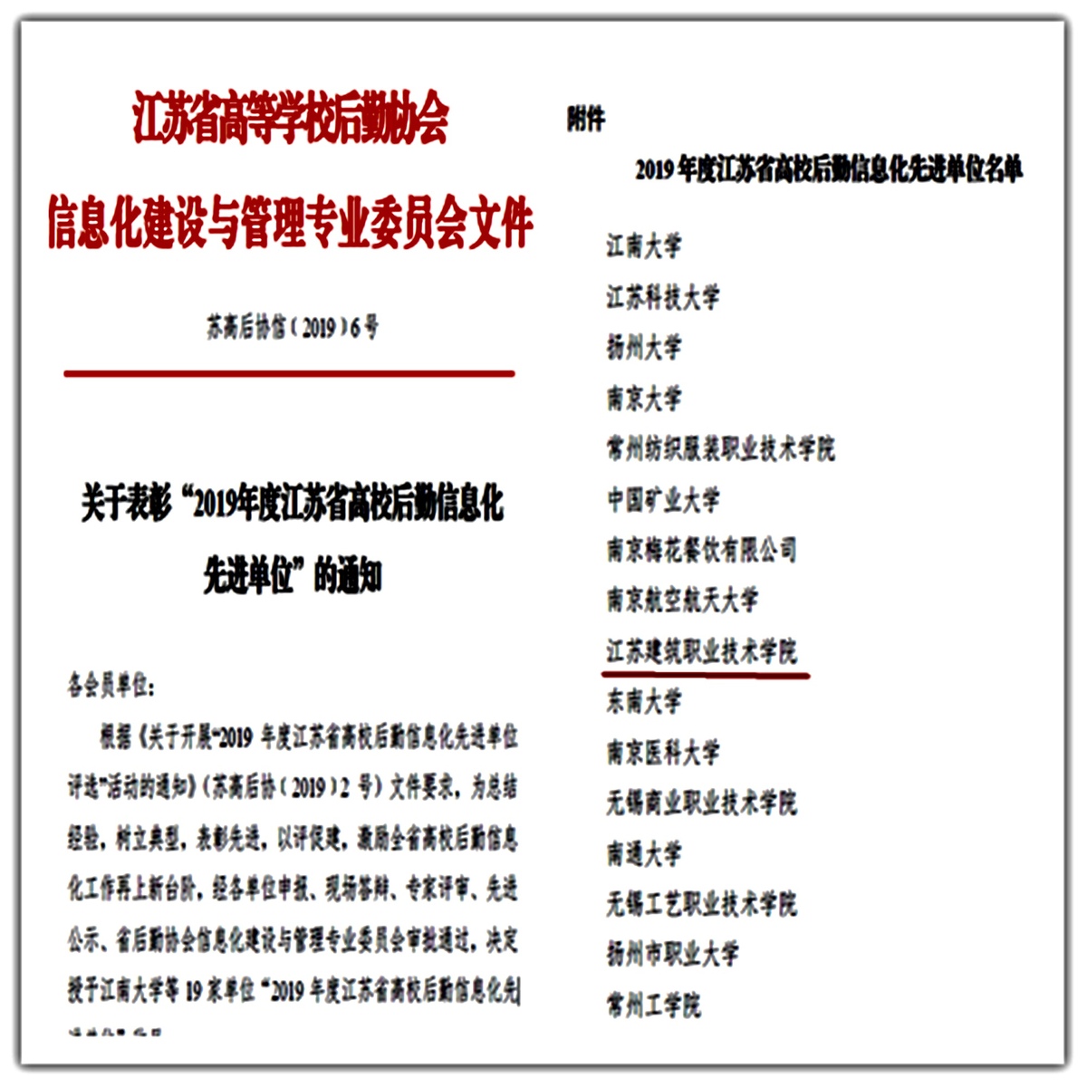 12月18日,全省高校后勤安全工作会议、第四届江苏省高校后勤互联网大会暨信息化建设与管理专业委员会2019年会在常州召开,我校副院长蒋兆峰、后勤中心主任王正扬参加会议。会议对2019年全省高校后勤系统信息化先进单位进行了表彰,我校后勤中心荣获“2019年度江苏后勤信息化建设先进单位”称号,后勤中心报送的《后勤数字化服务大厅——打造便捷的校园方式》入选江苏省高校后勤信息化优秀案例。