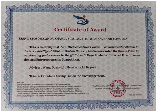 日前,第五届中国“互联网+”大学生创新创业大赛全国总决赛圆满落下帷幕。由我校柬埔寨留学生香林达、老挝留学生荣轩、宋浩然三人组成的项目团队,依托扎实的科研实力,精心打造的“New Partner of Smart Home--- Environmental Mutual Inductance Intelligent Window Control Device”项目在此次大赛中斩获全国铜奖。