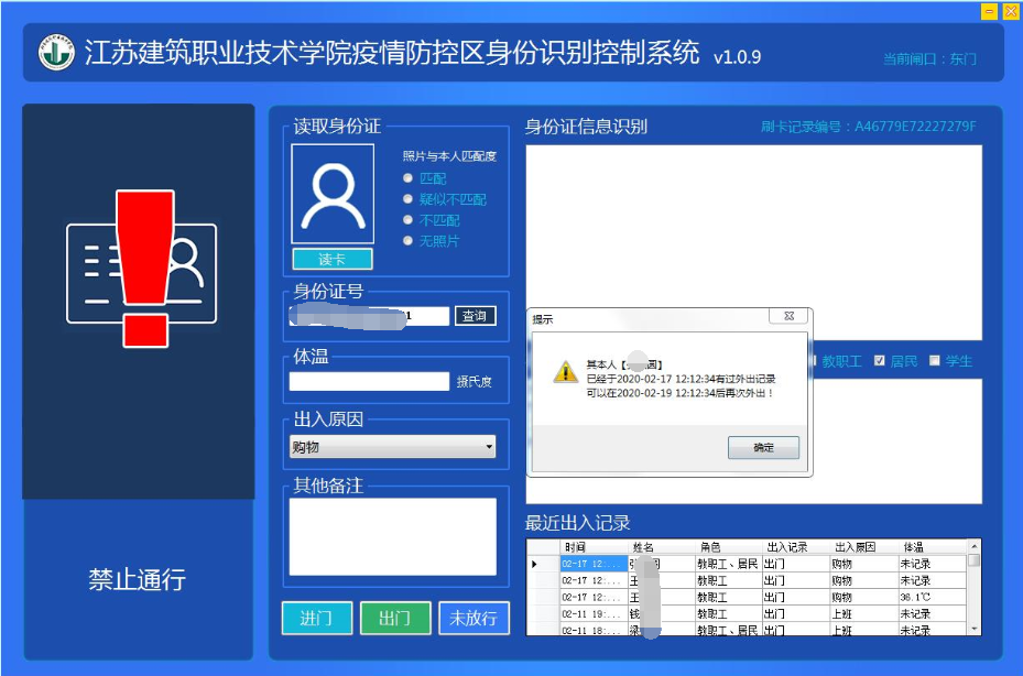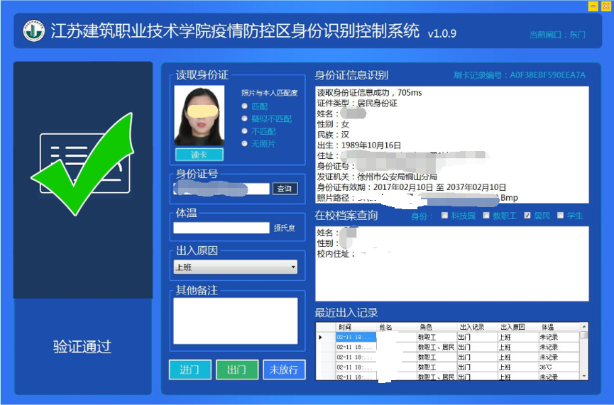 随着家属区封闭管理,身份识别控制系统及时上线,实现了利用现有的大数据技术对人员管控的精准化,准确识别校内外人员、查验48小时一户仅1人出入1次、隔离期人员身份区域限行、返校教工信息提醒、数据统计和智能分析等功能。