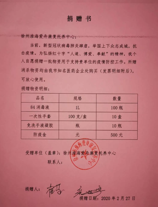 一场突如其来的“新型冠状肺炎”疫情,引起全国上下的关注,也牵动着我校教职工的心。在了解到徐州市淮海爱舟康复托养中心面向社会募集抗疫物资的信息后,2月27日,我校信息与网络中心党员崔莹同志将自费购买的100瓶八四消毒液、1000只一次性手套、10瓶免洗手液凝胶等消杀防护物资和爱心捐款500元,无偿捐赠到该中心,表达了对儿童康复工作的关心和支持。