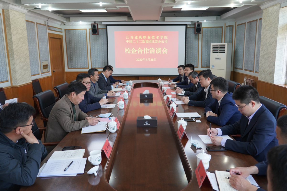 4月28日上午,中国二十二冶集团有限公司江苏分公司党委书记孙浩、总经理张盖一行8人来校洽谈校企合作事宜。副院长刘海波,组织部、科技处、校企合作处,建筑管理学院相关负责人参会交流。
