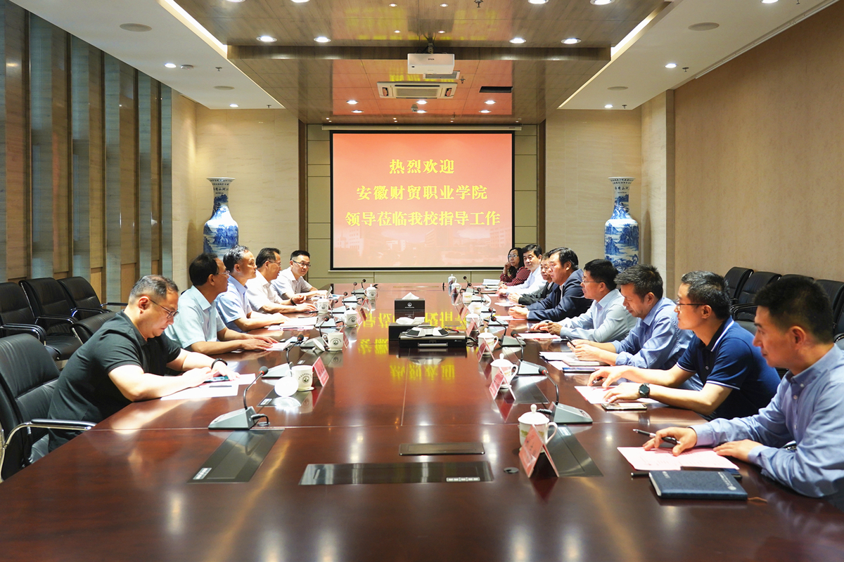 5月20日上午,安徽财贸职业学院党委书记张志祥、院长刘银国一行6人来我校进行调研考察。党委书记孙进教授、院长沈士德教授、纪委书记魏勇与来访客人在图书馆会议室进行座谈交流。党政办、组织部、教务处、人事处、科技处、大学科技园等部门负责人参加了座谈。