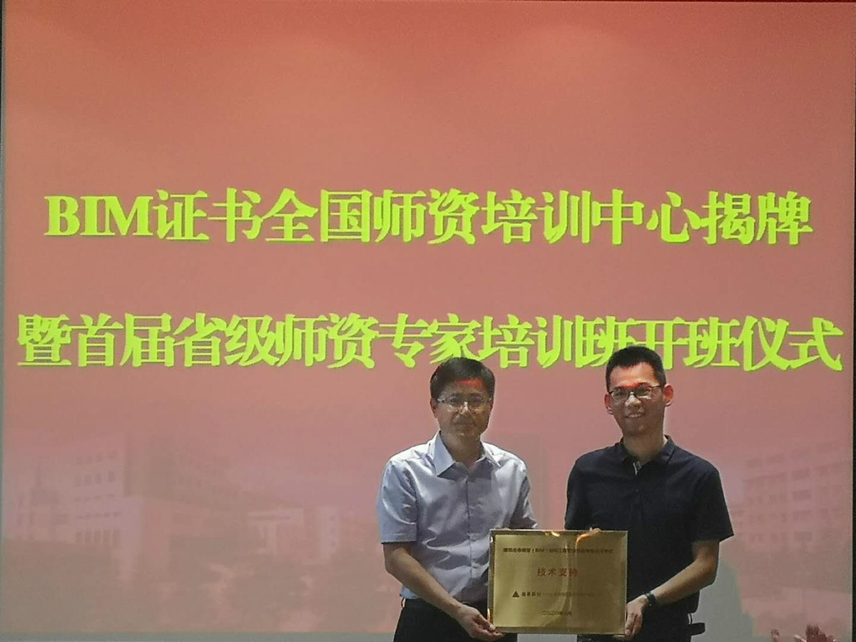 会上,胡晓光和沈士德共同为BIM证书全国师资培训中心成立揭牌。三家信息技术企业代表也为支持我校开展结构工程师培训及考试提供软件技术支持进行了承诺授牌。