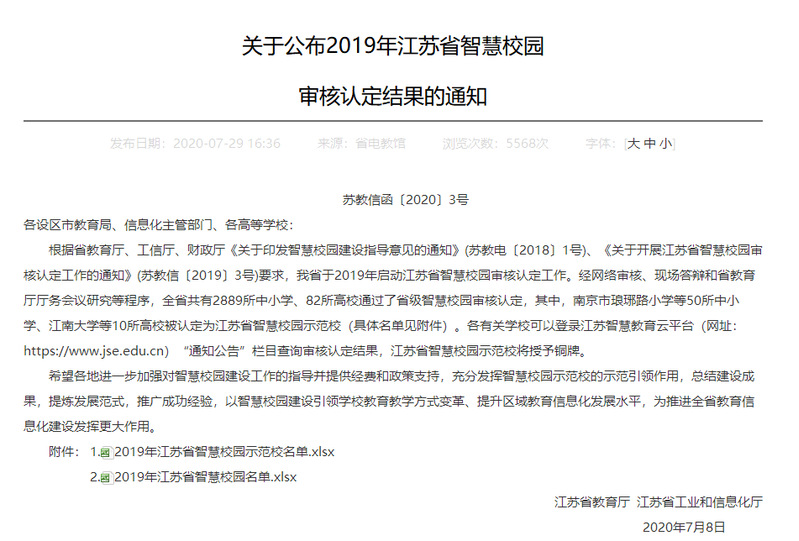 近日,江苏省教育厅、江苏省工业和信息化厅公布了2019年江苏省智慧校园审核认定结果,我校成为江苏省首批高校智慧校园。