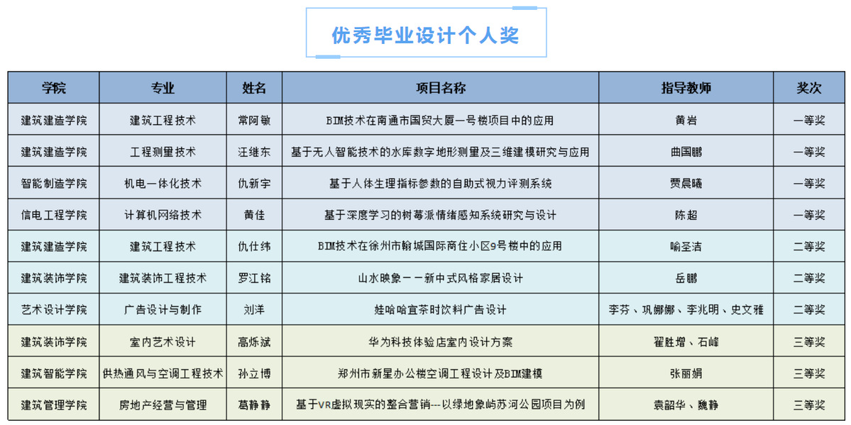 近日,江苏省教育厅公布了2019年江苏省普通高校本专科优秀毕业设计(论文)评选结果,我校报送的10项个人毕业设计和3项团队毕业设计全部榜上有名,共获优秀毕业设计个人一等奖4项,二等奖3项,三等奖3项,优秀毕业设计团队奖3项。此次评选共评出27项一等奖,我校获得4项,位居全省第一,创造了学校历史最佳成绩。