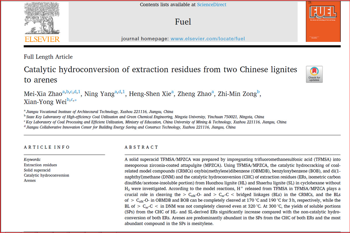 近日,我校建筑建造学院赵美霞博士以第一作者身份在能源领域著名期刊Fuel(中科院I区,影响因子5.578)上发表了题为《Catalytic hydroconversion of extraction residues