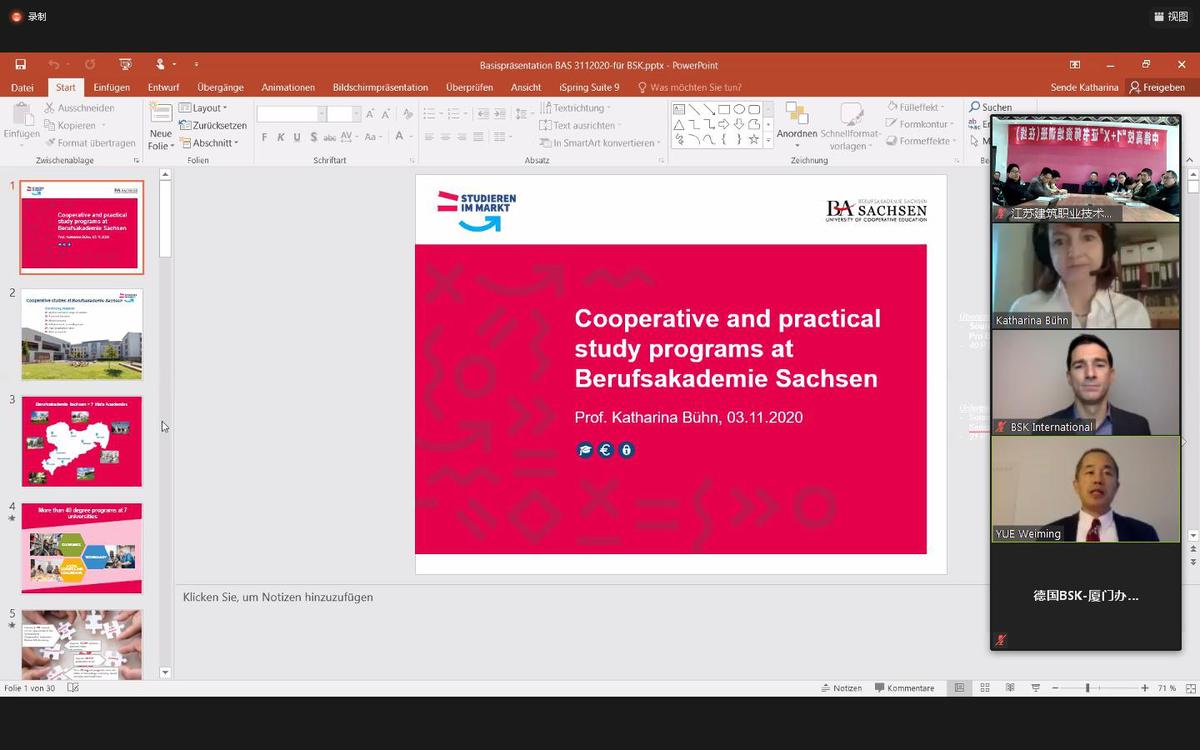 为推进中国特色高水平专业群(建筑装饰工程技术)建设相关工作,在国际合作与交流处组织协调下,11月3日下午,我校与德国萨克森双元制大学举办了中德高校“1+X”证书线上专题会议,该专业群60余名专任教师参加了会议。