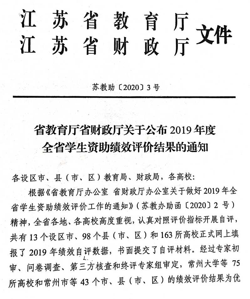 近日,省教育厅、省财政厅联合下发了《省教育厅省财政厅关于公布2019年度全省学生资助绩效评价结果的通知》(苏教助〔2020〕3号),我校学生资助工作绩效评价再次荣获优秀等次,这是我校自2010年省教育厅实行学生资助工作绩效评价以来,连续九年获此殊荣。
