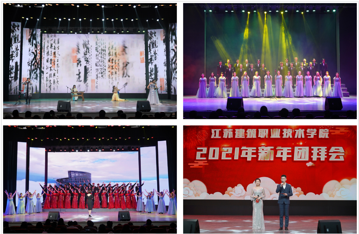 新年团拜会在管乐团振奋人心的乐曲中拉开序幕。音乐快板《总书记来到咱身边》《啦啦操》等节目传递着青春的活力和勃勃生机;身处学生工作第一线的辅导员为我们带来了音舞话《乘风破浪的辅导员》,展现了我校青年教师队伍昂扬向上的精神风貌;女教师旗袍秀《丝路青花》、舞蹈《运河漕夫》、民乐合奏《水龙吟》为大家呈现了一场传统文化盛宴,彰显传统文化魅力;朗诵《追寻》讲述了科研人员拼搏奋斗,弘扬民族精神,与祖国同行,与时代同行的故事;舞蹈《咏梅》《我的祖国》舞出了建院人勇敢承担使命召唤,一同携手并进以及对新时代的美好期盼。新年团拜会在合唱歌曲《向往》激昂的歌声中落下帷幕。