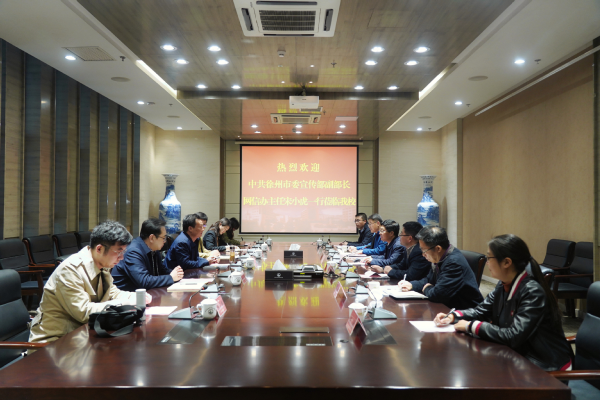 3月26日下午,徐州市委宣传部副部长、网信办主任宋小虎,徐州市委网信办副主任李森等一行6人莅临我校,调研高校意识形态建设情况,网络意识形态责任制落实情况。院长沈士德教授、党委宣传部、党委学工部、党委保卫部、信息与网络中心等部门负责同志参加座谈。