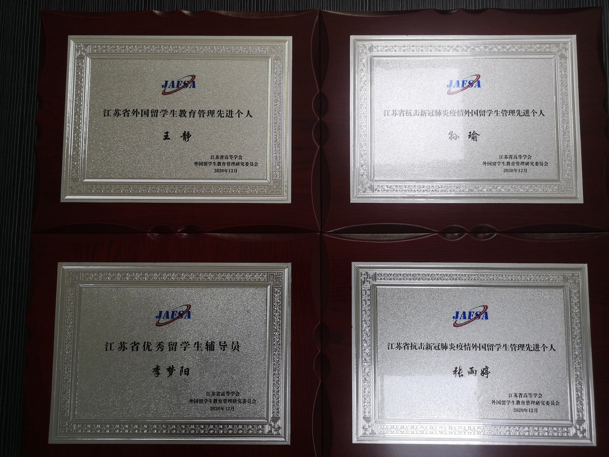 会上,何斌在“疫情防控常态化下的来华留学生管理”研讨会上作了题为《筑牢安全底线,服务高质量发展》的发言。国际交流学院王静获评“江苏省外国留学生教育管理先进个人”,李梦阳获评“江苏省优秀留学生辅导员”,孙瑜、张雨婷获评“江苏省抗击新冠肺炎疫情外国留学生管理先进个人”。