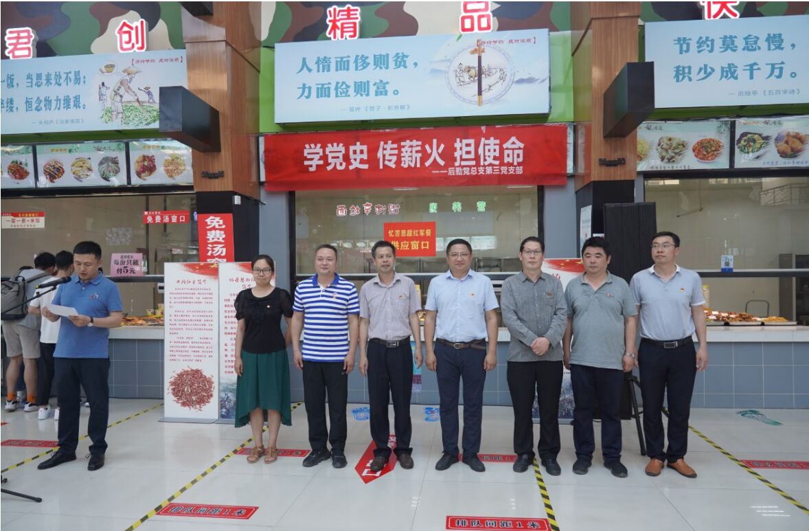 为贯彻落实学校党委关于开展党史学习教育的部署要求,后勤管理服务中心党总支扎实落实党史学习教育实施方案,紧扣工作重点,着力推进党史学习教育走深走实。依托学生餐厅和外包企业党员,开展主题为“学党史、传薪火、担使命”的建党100周年暨党史学习教育体验系列活动,在第四学生餐厅设置了“忆苦思甜红军餐”窗口并打造红色故事宣讲场地和党史学习角。