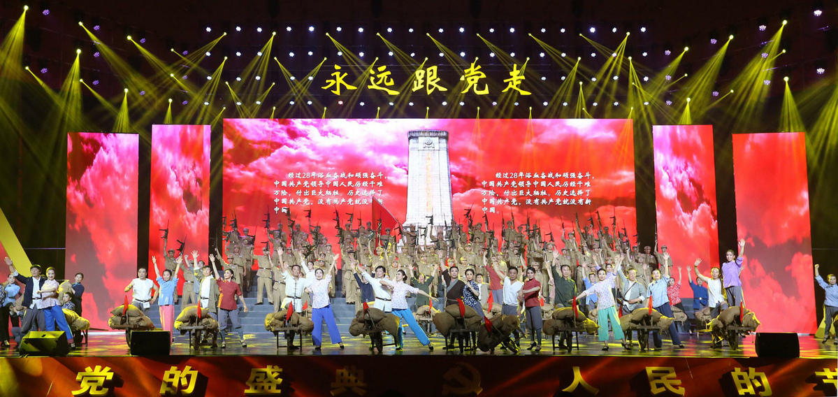 6月27日晚,由徐州市委、市政府主办的“永远跟党走——徐州市庆祝中国共产党成立100周年文艺晚会”在奥体中心举行。我校建筑装饰学院200名学生共参与演出了《破晓的曙光》、《国际歌》、《徐州是英雄的故乡》、《伟大的旗帜》和《淮海英雄赋》5个节目。我校是本次参演人数最多、参演节目最多的单位。