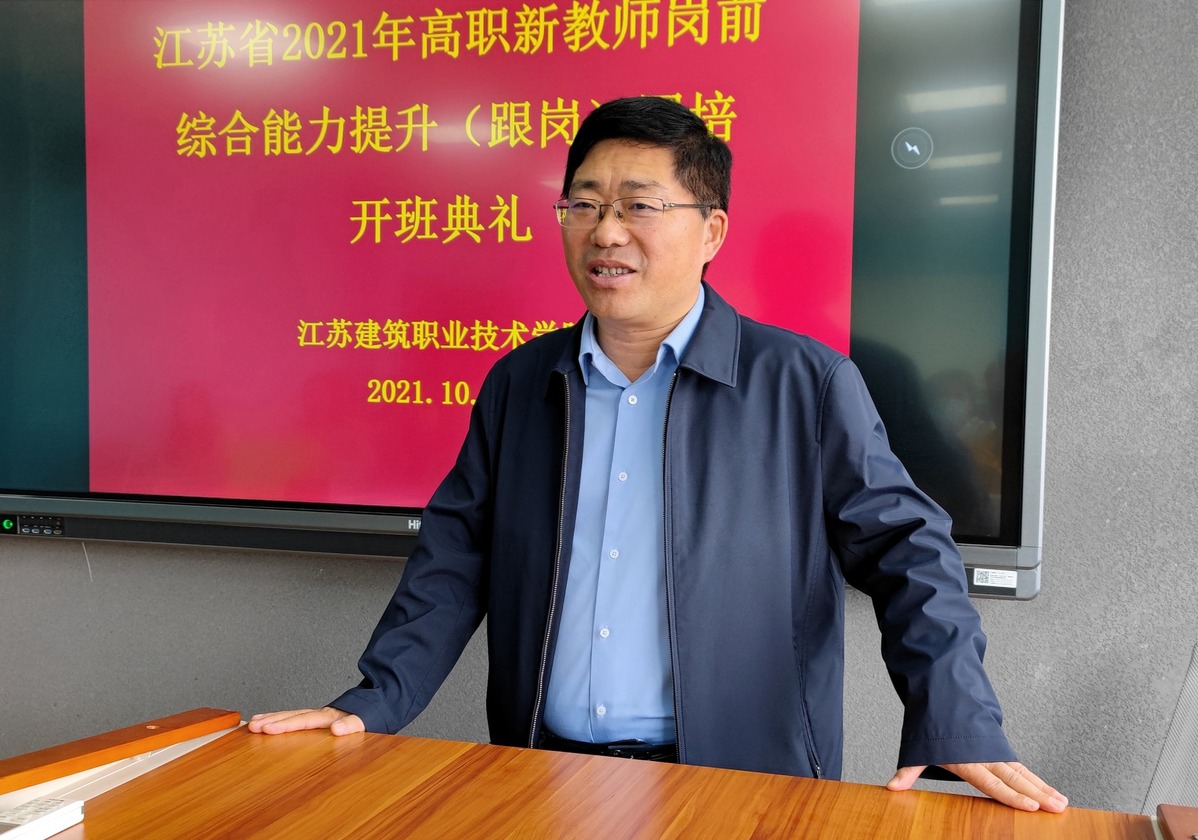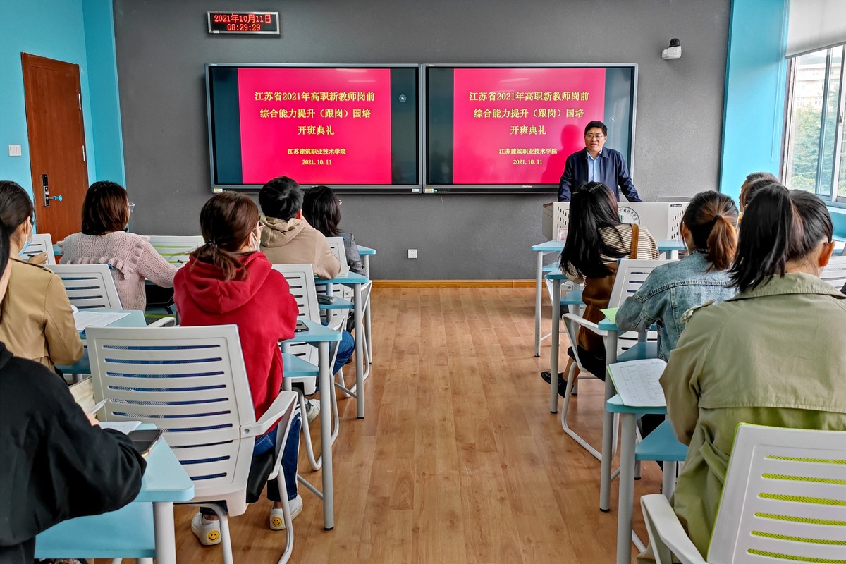 10月11日上午,由江苏省教育厅主办、我校承办的江苏省2021年高职新教师岗前综合能力提升(跟岗)国培项目在我校教一楼智慧教室开班。院长沈士德教授、相关部门负责人以及来自16所高职院校的21名教师学员出席开班仪式。该项目培训期为28天。