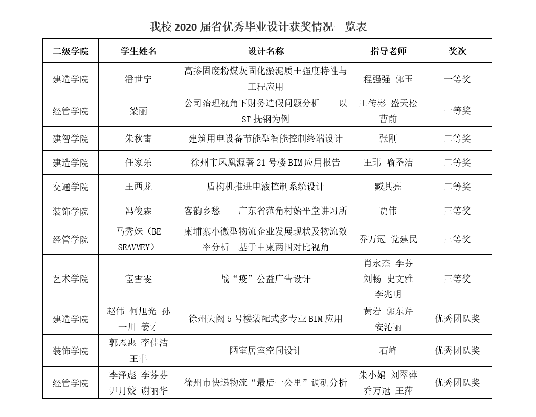 近日,江苏省教育厅公布了2020年江苏省普通高校本专科优秀毕业设计(论文)抽检结果,我校获得优秀毕业设计个人一等奖2项、二等奖3项、三等奖3项,优秀毕业设计团队优秀奖3项,抽检建筑工程技术专业2项毕业设计全部合格。此次全省专科层次共评出优秀毕业设计个人一等奖26项、二等奖65项、三等奖89项,优秀团队奖89项。