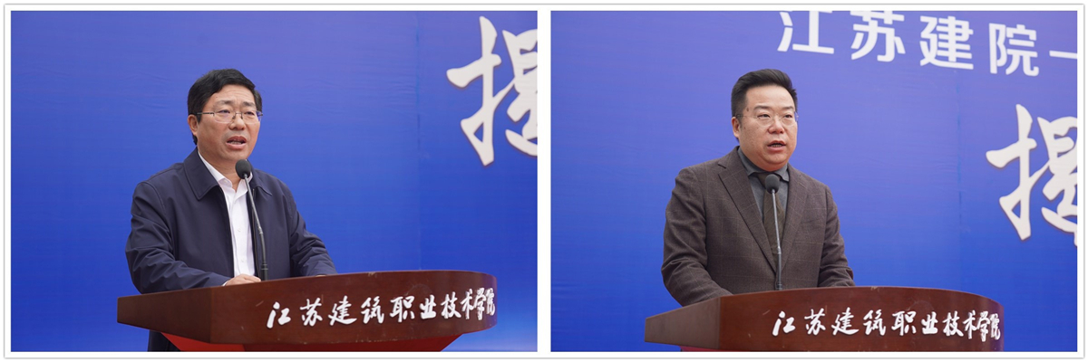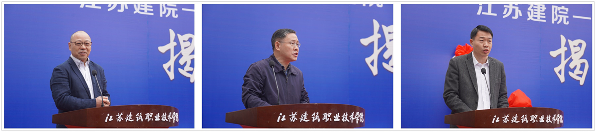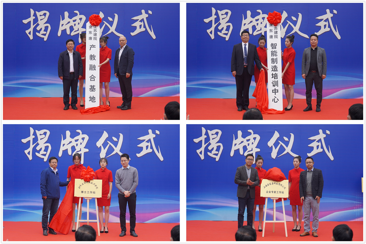 郑谦代表上海金东唐科技有限公司、邢邦圣代表兄弟院校、陈都标代表市人社局先后讲话。沈士德、郑谦等为“江苏建院-金东唐产教融合基地”、“江苏建院-金东唐智能制造培训中心”、“华体会体育博士工作站”、“金东唐企业专家工作站”揭牌。