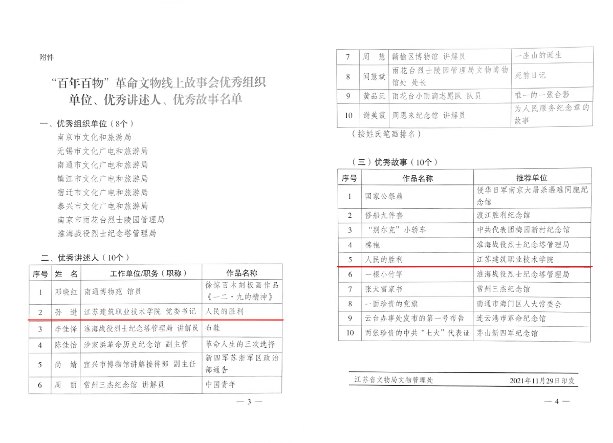 近日,江苏省文物局公布《关于公布“百年百物”革命文物故事会优秀单位、优秀讲述人、优秀作品的通知》(苏文物革〔2021〕13号),由我校选送的《人民的胜利》获得“优秀故事”,党委书记孙进教授荣获“优秀讲述人”。