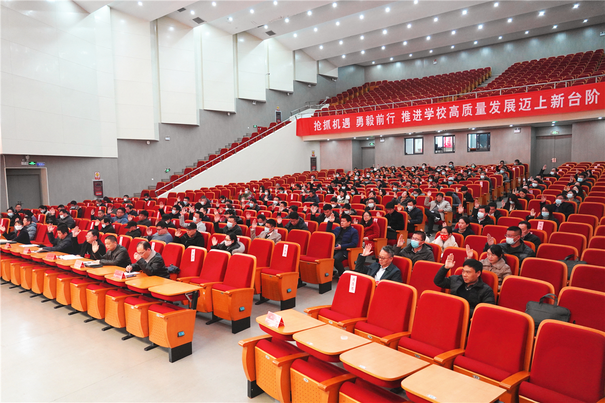 大会听取并审议通过了院长沈士德教授所作的题为《抢抓机遇 勇毅前行 推进学校高质量发展迈上新台阶》的学校工作报告。报告全面回顾了2021年学校工作情况,从党的全面领导持续深化、学校内涵发展持续增强、开放办学提升学校活力、师生共享智慧幸福校园等四个方面总结了学校的发展成就,并客观分析了学校发展过程中存在的不足与面临的机遇。报告中,沈士德还对2022年的重点工作进行了全面部署,从强化政治引领、加强内涵建设、提高育人质量、提升保障能力等四个方面为学校绘制了发展蓝图。