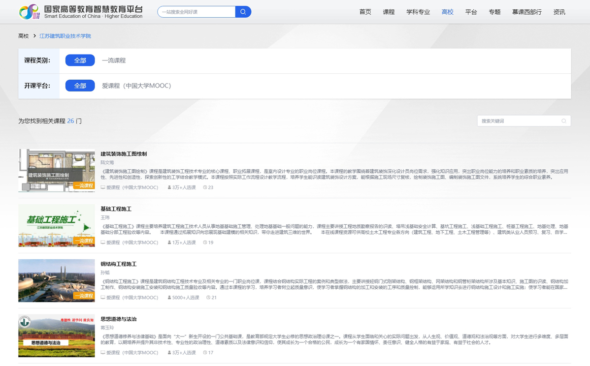近日,国家高等教育智慧教育平台正式上线运行,江苏省共17所高职院校211门优质课程入驻该平台,我校26门课程入选,数量居省内高职院校首位。