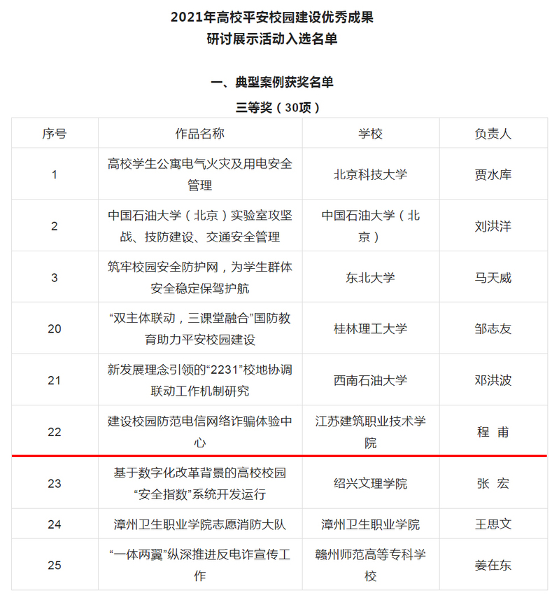 近日,由教育部思想政治工作司和中国高等教育学会共同指导,全国高校思想政治工作网、中国高等教育学会保卫学专业委员会、高校思想政治工作队伍培训研修中心(高等教育出版社)联合举办的“2021年高校平安校园建设优秀成果研讨展示活动”,公布遴选结果,评选出50个研究成果、50个典型案例。我校报送的“建设校园防范电信网络诈骗体验中心”案例荣获2021年全国高校平安校园建设优秀成果典型案例三等奖。