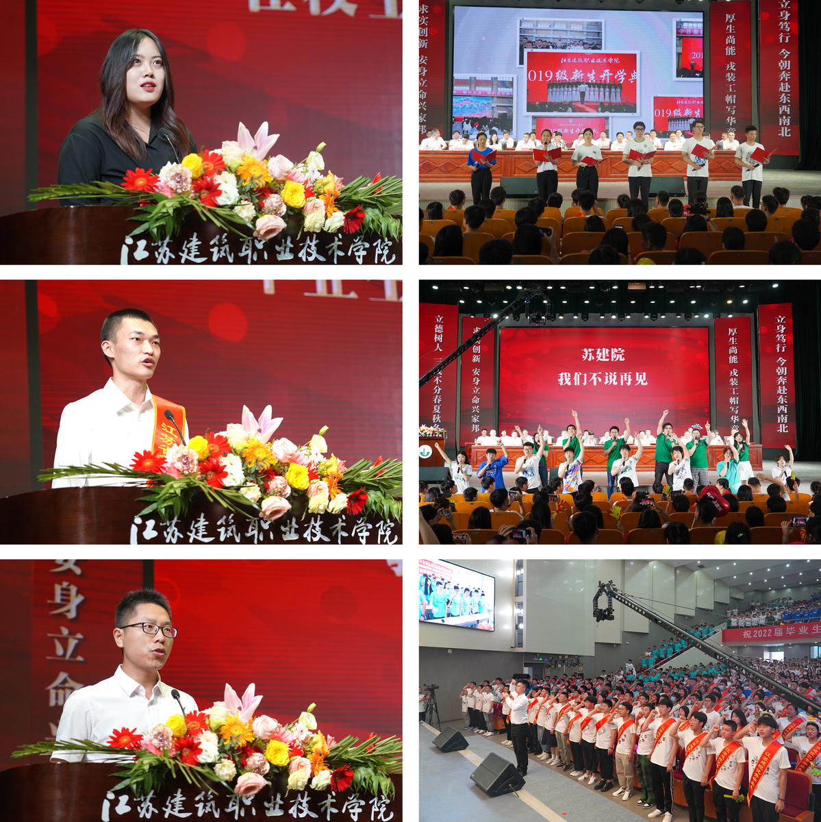 沈士德为“心中的恩师”、“最美守护者”颁发荣誉证书并致辞。他在致辞中代表学校对4506名圆满完成学业的2022届毕业生表示祝贺,向教诲毕业生成才的师长、养育毕业生成长的家长致以感谢。沈士德带领大家简要回顾了三年大学生涯中的“独家记忆”,“新中国70华诞”“建党100周年”“新冠病毒肺炎疫情”“建校40周年”等。为帮助和启迪全体毕业生在未来工作、学习、生活道路上进一步做好人生规划,沈士德送上三条寄语:一要坚定理想信念,增强做“铮铮铁骨”建院人的志气,继续传承好学校的文化与精神,努力成长为有理想、敢担当、能作为的新时代青年;二要坚持拼搏奋斗,增强做“勇毅笃行”建院人的骨气,大力弘扬劳模精神、劳动精神、工匠精神,守护好尊严与荣耀,争做新时代的实干家;三要坚持精益求精,增强做“矢志创新”建院人的底气,努力从技术技能人才向能工巧匠、大国工匠转变,以真才实学服务社会,创造出更多成就与辉煌。