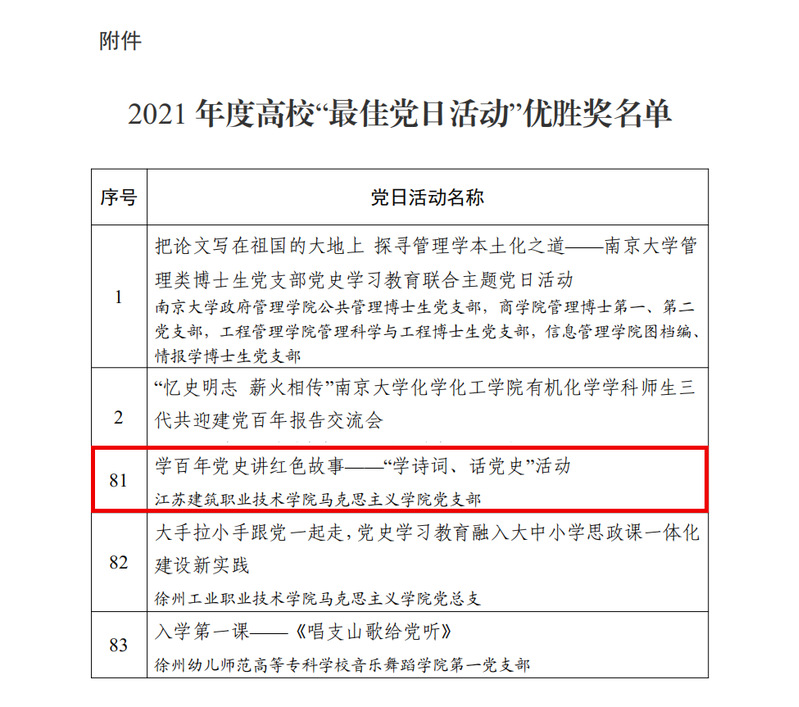 日前,江苏省委教育工委公布了2021年度高校“最佳党日活动”优胜奖评选结果,我校马克思主义学院党支部开展的“学百年党史讲红色故事——学诗词、话党史”主题党日活动获2021年度高校“最佳党日活动”优胜奖。